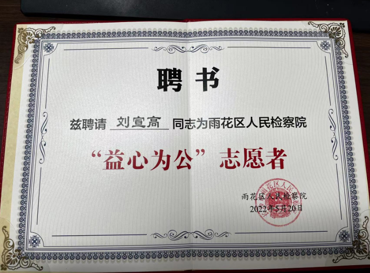 2022年5月20日,在雨花區(qū)人民檢察院舉行的“益心為公”檢察云平臺(tái)啟動(dòng)暨志愿者聘任儀式和業(yè)務(wù)培訓(xùn)會(huì)上,我公司劉宣高獲聘成為“益心為公”志愿者。